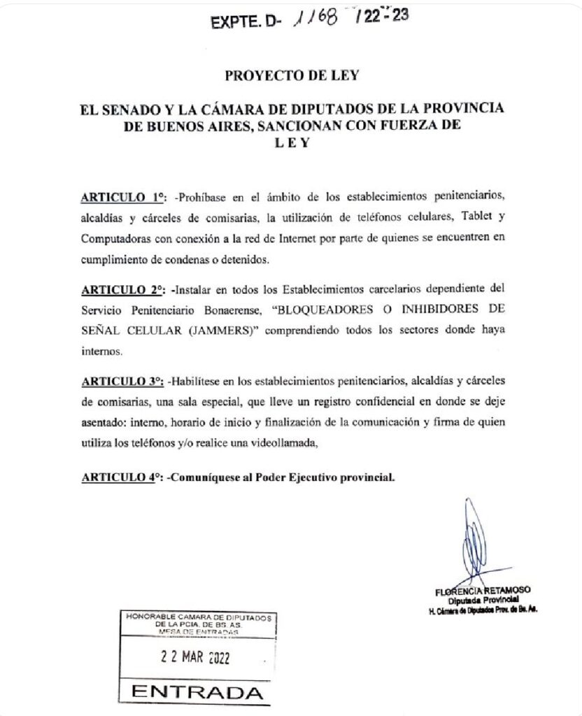 La referente de Juntos manifesto: «Le recuerdo @kicillofok que hace un año presenté un proyecto para prohibir celulares y colocar inhibidores en las cárceles de la provincia. Ustedes lo archivaron.