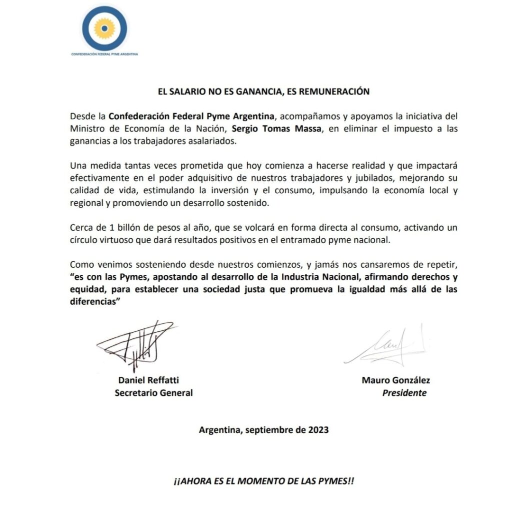 Desde la Confederación Federal Pyme Argentina, acompañamos y apoyamos la iniciativa del Ministro de Economía de la Nación, Sergio Tomas Massa, en eliminar el impuesto a las ganancias a los trabajadores asalariados.