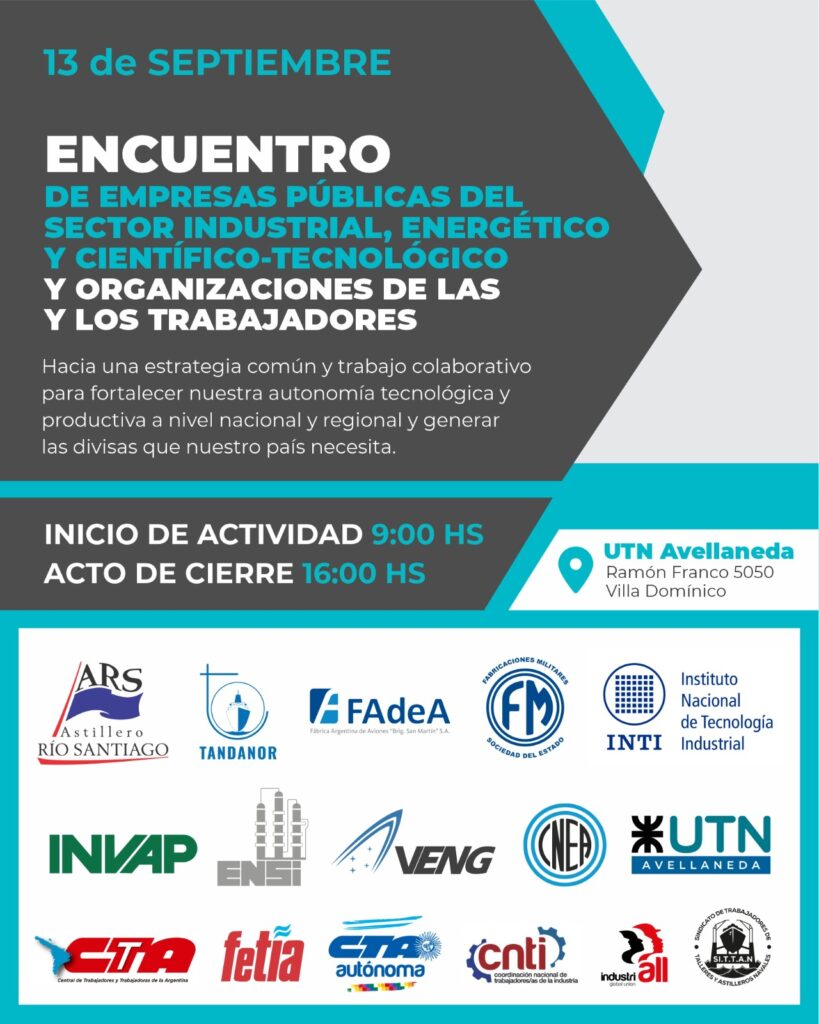 En la UTN Regional Avellaneda se reunieron empresas públicas, trabajadores, cámaras, sindicatos para elevar las debilidades y fortalezas de cada parte y con los aportes realizar un documento común para ser presentado ante las autoridades nacionales y candidatos presidenciales en las próximas elecciones. El mismo se denomina «Encuentro de Empresas Públicas del Sector Industrial, Energético y Científico-Tecnológico y las organizaciones de las y los trabajadores»