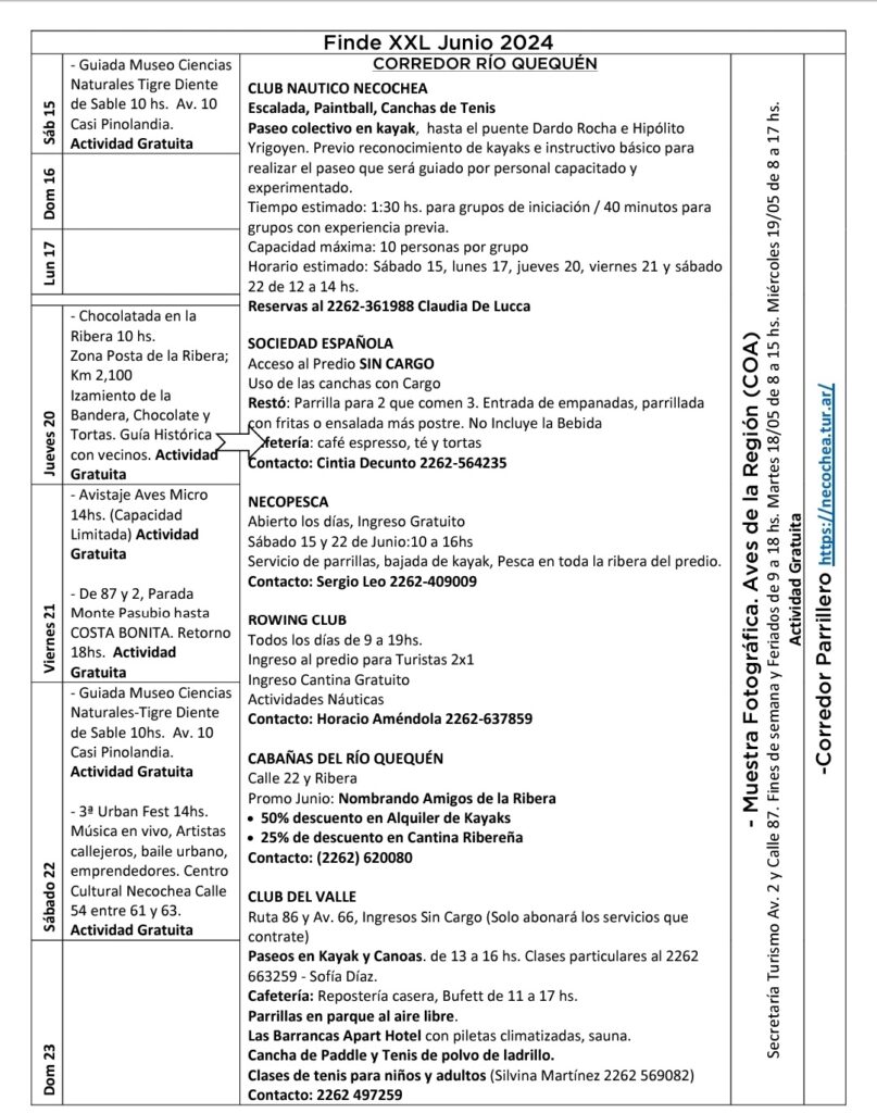 Por tratarse de otoño, el área a cargo de Matías Sierra, diseñó una propuesta con eje en el río Quequén, integrada con todas las actividades que los prestadores turísticos, clubes y la asociación de vecinos del “Paseo de la Ribera” ofrecerán para esos días que van desde paseos en kayak, acceso a los predios de manera gratuita, parrilladas y hasta café con torta y chocolatada.