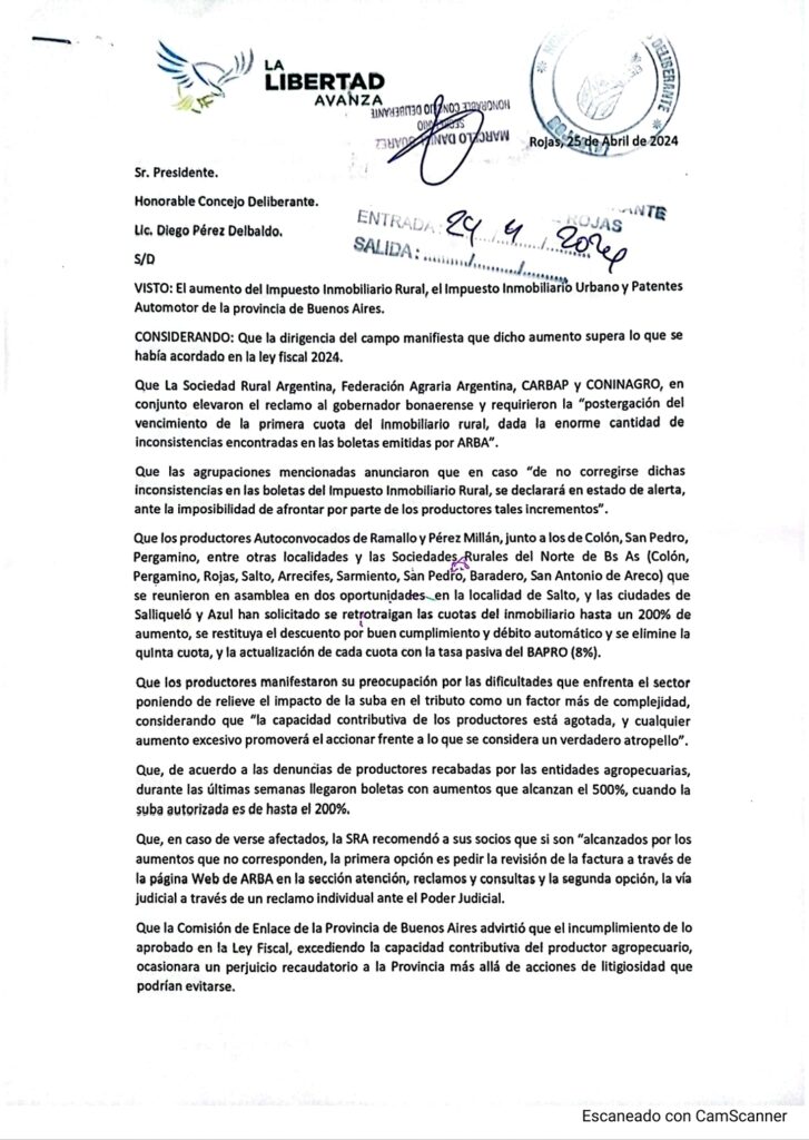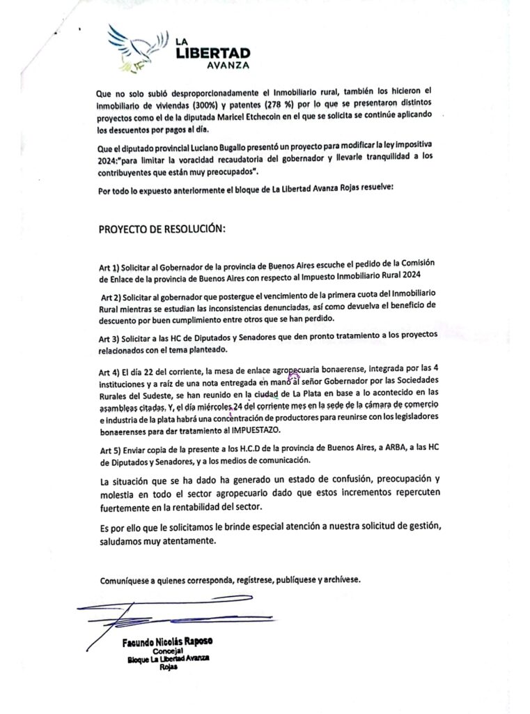 El Bloque de la Libertad Avanza en el H. Concejo Deliberante de la ciudad de Rojas ingresó el escrito firmado por el Concejal Facundo Nicolas Raposo.